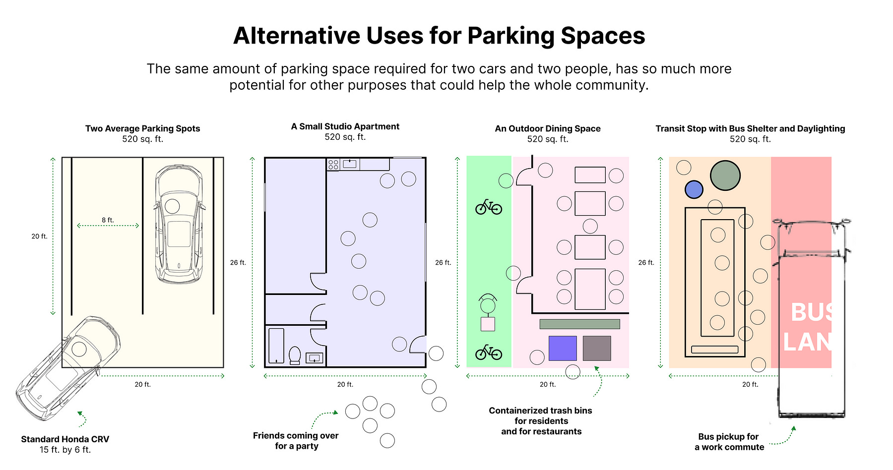 Two parking spot spaces should be for more than just two people and cars. Two parking spots can make up one studio apartment. Two parking spots can create outdoor dining space for cafes and restaurants, with room for waste containers. Two parking spots can provide room for a bus shelter, bus pickup, and daylighting.